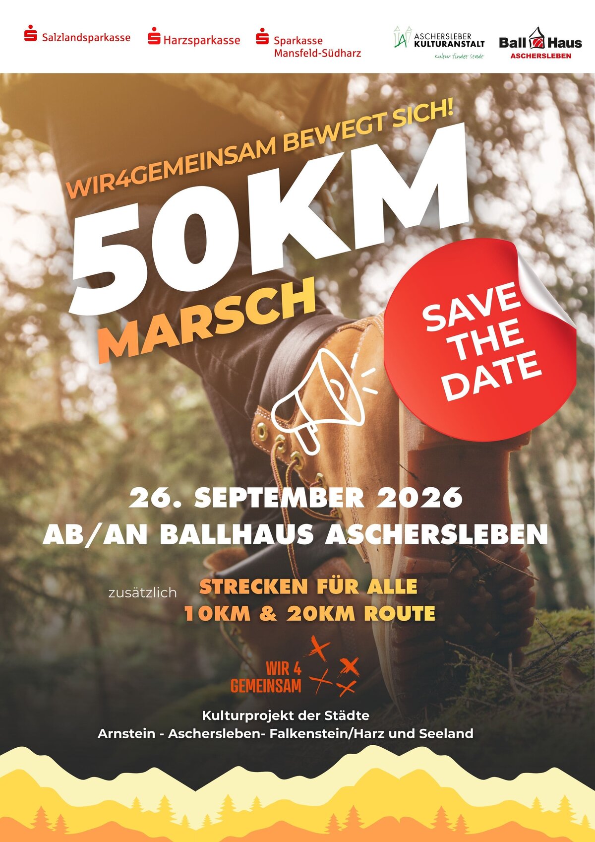 Wir freuen uns, dass wir im Rahmen des Kulturprojektes #Wir4gemeinsam den sehr beliebten 50 km Marsch wieder aufleben lassen können. Neu ist, dass es auch eine 10 km und eine 20 km Strecke zum Wandern geben wird.